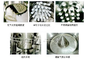 將制粒用的粉末物料放入流化床內(nèi),物料粉末粒子在原料容器中呈環(huán)形流化狀態(tài),受到經(jīng)過凈化后的加熱空氣預(yù)熱和混合,將粘合劑溶液霧化噴入,使若干粒子聚集成含有粘合劑的團粒,由于熱空氣對物料的不斷干燥,使團粒中水分蒸發(fā),粘合劑凝固,此過程不斷重復(fù)進行,形成理想的、均勻的多微孔球狀顆粒。
